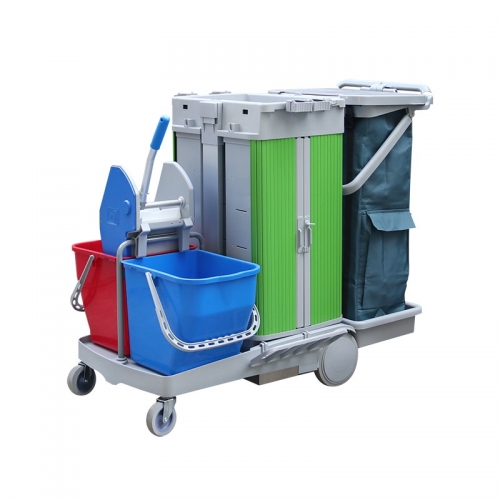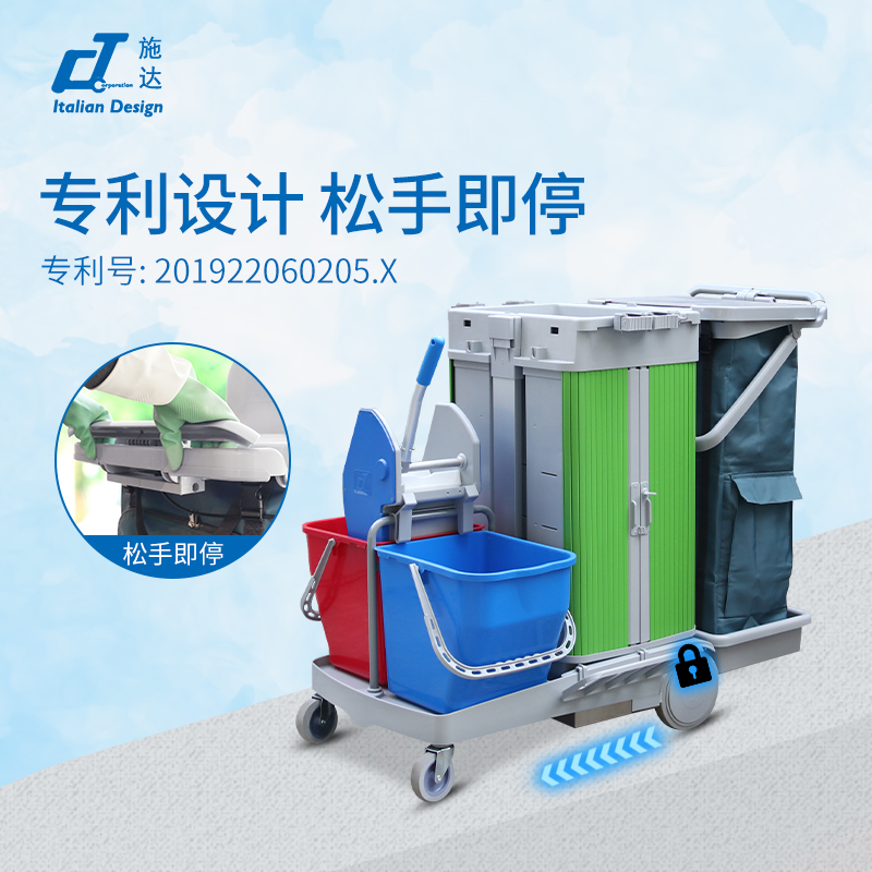 手推车上设有多层架子和隔板,可以清晰地分类存放拖把、抹布、清洁剂、垃圾袋等各种清洁工具和物品。方便工作人员快速找出需要的工具,无需来回走动寻找物品,省去许多无谓的时间和精力。手推车上的把手采用特殊材料制作,既舒适又防滑,即使推动满载也无需担心安全问题。
