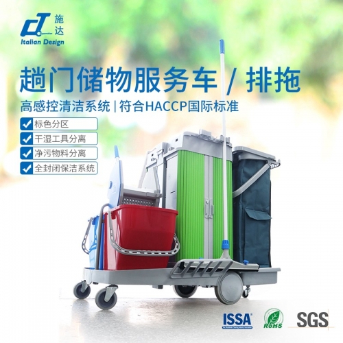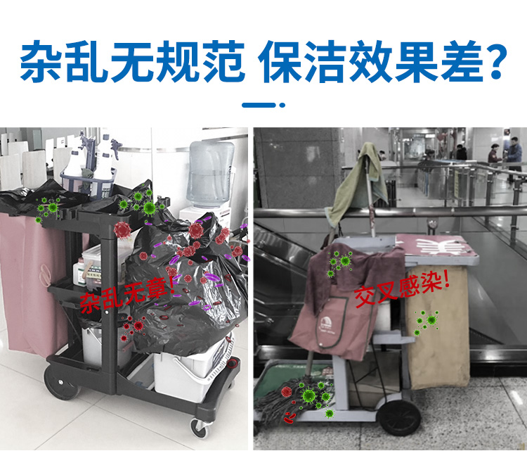 手推车上设有多层架子和隔板,可以清晰地分类存放拖把、抹布、清洁剂、垃圾袋等各种清洁工具和物品。方便工作人员快速找出需要的工具,无需来回走动寻找物品,省去许多无谓的时间和精力。手推车上的把手采用特殊材料制作,既舒适又防滑,即使推动满载也无需担心安全问题。